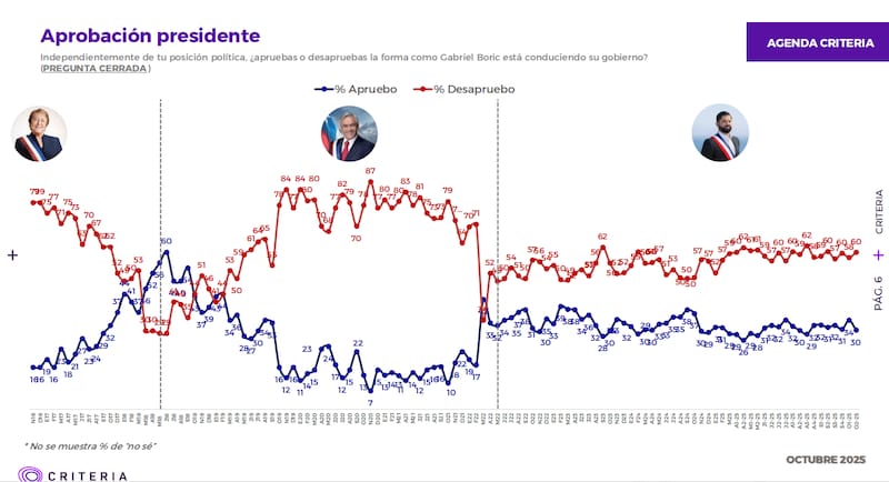 En esta última medición, la aprobación a la figura del Presidente Gabriel Boric sufrió un fuerte descenso (-4) en su aprobación, que pasó a ser de 30%. En tanto, un 60% (+2) desaprueba la conducción del Mandatario.