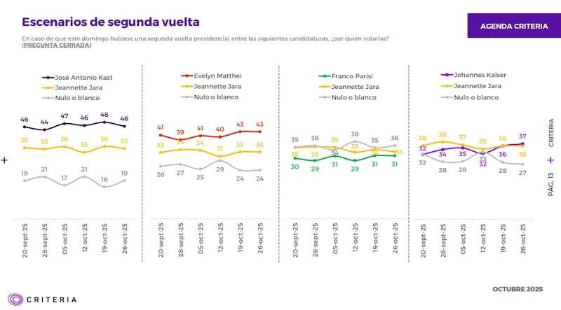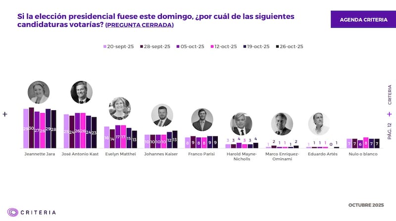 La mañana de este domingo 26 de octubre, Criteria publicó los resultados de su última encuesta, la que mostró que la carta oficialista Jeannette Jara (PC) se mantiene en el primer lugar de las preferencias presidenciales, mientras José Antonio Kast (Partido Republicano) y Evelyn Matthei (UDI) registran descensos en sus apoyos.
