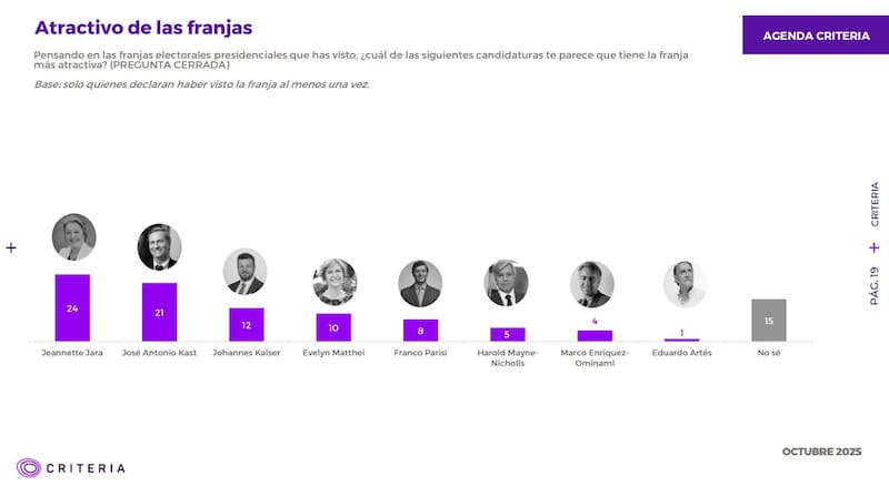 Entre quienes sí la vieron, la franja más atractiva fue la de Jeannette Jara, con 24% de las menciones, seguida por la de José Antonio Kast, con 21%. Más atrás se ubican Johannes Kaiser (12%), Evelyn Matthei (10%), Franco Parisi (8%) y Harold Mayne-Nicholls (5%).