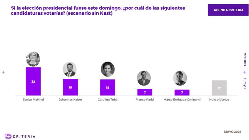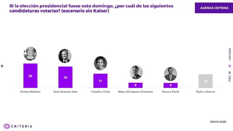 En una eventual primera vuelta sin Kaiser, Matthei llegaría a 29% y Kast subiría a 26%, quedando Tohá en tercer lugar con 17%.