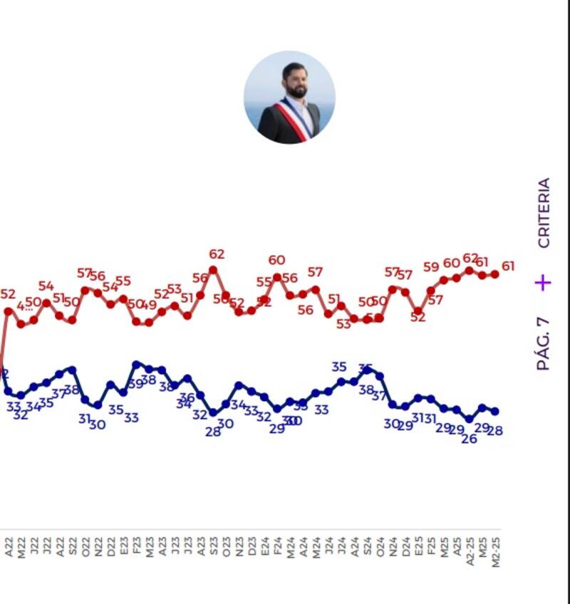 Por otro lado,evaluación del presidente Gabriel Boric continúa en niveles bajos, llegando al 28% (-1 punto), mientras que la desaprobación se mantiene en 61%.