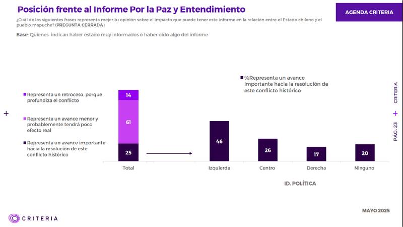 Respecto a su impacto, solo un 25% considera que representa un avance importante para resolver el conflicto entre el Estado y el pueblo mapuche. Para el 61%, el informe constituye un “avance menor con poco efecto real”, mientras que un 14% lo ve como un retroceso.