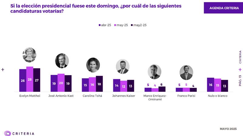 Evelyn Matthei sigue liderando las preferencias presidenciales, según reveló la segunda medición de mayo de la encuesta Criteria.