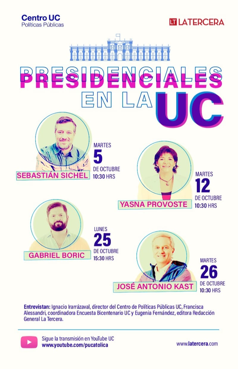 Este martes se realizó la primera edición del ciclo “Presidenciales en la UC”, organizado por La Tercera y el Centro de Políticas Públicas de la Pontificia Universidad Católica, en el que serán entrevistados cuatro de los candidatos a La Moneda: Sebastián Sichel, Yasna Provoste, Gabriel Boric y José Antonio Kast.