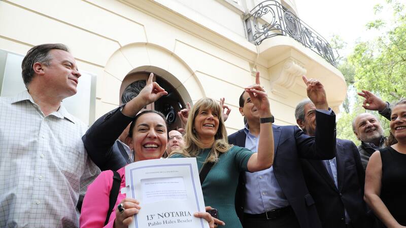 La actividad de este viernes se había fijado para las 11.30 horas, pero tuvo lugar con más de una hora de retraso. Los adherentes de la agrupación esperaron a que Ximena Rincón llegara desde una notaría con los documentos respectivos.
