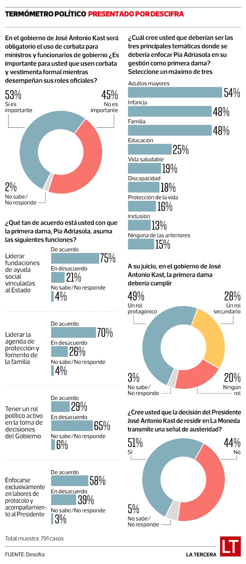 Así por ejemplo se preguntó respecto sobre el rol que debería cumplir la primera dama en el gobierno de Kast. Un 49% se inclinó por “un rol protagónico”. Mientras un 28% sostuvo que “un rol secundario”. Un 20% señaló que María Pía Adriasola no debería cumplir “ningún rol”. Finalmente, un 3% no “sabe o no contesta”.
