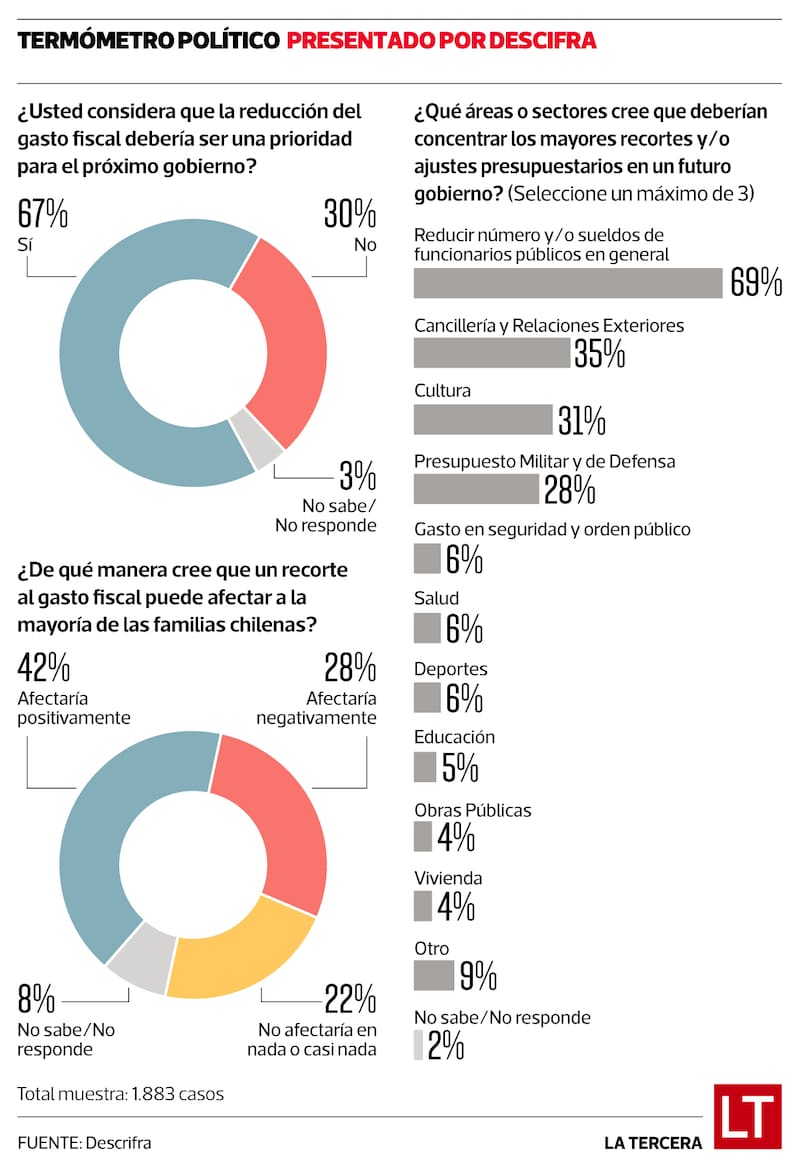 La última entrega del "Termómetro político" arrojó, además, que el 67% cree que la reducción del gasto del Estado debería ser una prioridad para quien llegue a La Moneda.