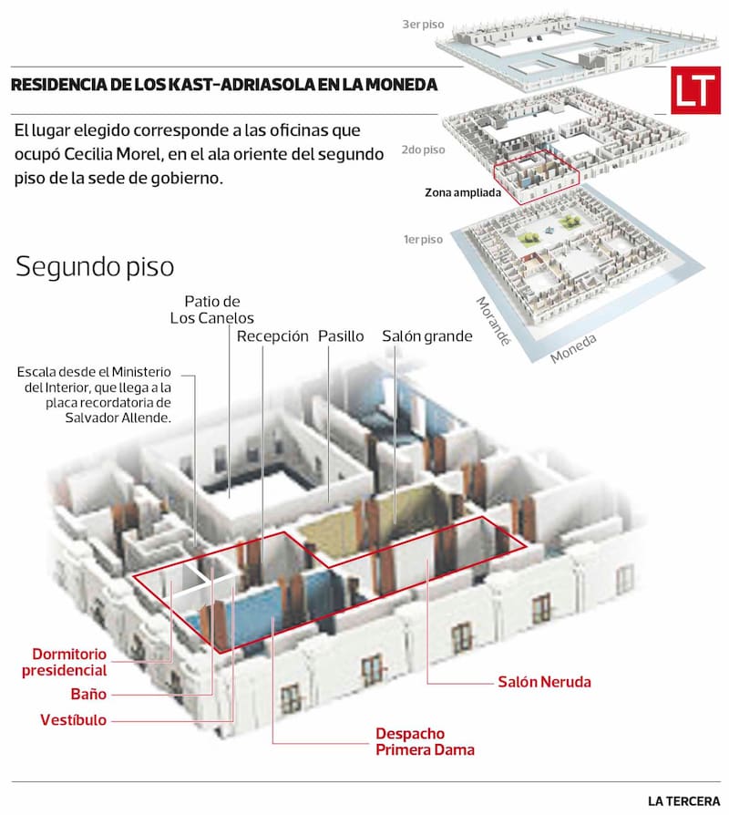 De los casi 19 mil metros cuadrados y 40 habitaciones, dos espacios eran los más factibles: las dependencias del tercer piso -ubicadas en el centro de la sede de gobierno, hacia la Plaza de la Constitución- y el despacho -en el ala nororiente del segundo piso- que ocupó Cecilia Morel como exprimera dama, en las dos administraciones del fallecido expresidente Sebastián Piñera.