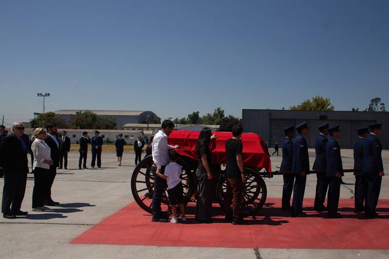 Los restos del exmandatario fueron esperados la base de la Fuerza Aérea en el Aeropuerto Pudahuel por el Presidente Gabriel Boric, quien estuvo acompañado del canciller Alberto van Klaveren y las ministras del Interior, Carolina Tohá, y de la Secretaría General de Gobierno, Camila Vallejo. Una banda de la FACh rindió honores al expresidente.