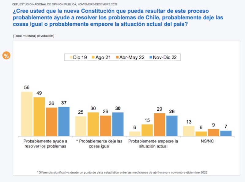 En esta pregunta la tendencia venía a la baja y los datos dan cuenta de un leve repunte. Este sondeo muestra que, a noviembre y diciembre del año pasado, un 37% cree que la nueva Constitución “probablemente ayude a resolver los problemas”. El alza respecto de la última medición -de abril y mayo de 2022- es de un punto por lo que el aumento no es estadísticamente relevante.
