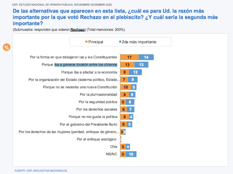 La medición muestra que las tres principales razones para quienes votaron Rechazo fueron las siguientes. La primera apunta a una mala valoración por la “forma en que trabajaron las y los constituyentes”. En segundo lugar se menciona que la propuesta de nueva Constitución “iba a generar división entre los chilenos”. Como tercera razón, los encuestados mencionan que rechazaron el texto porque iba a afectar la economía.