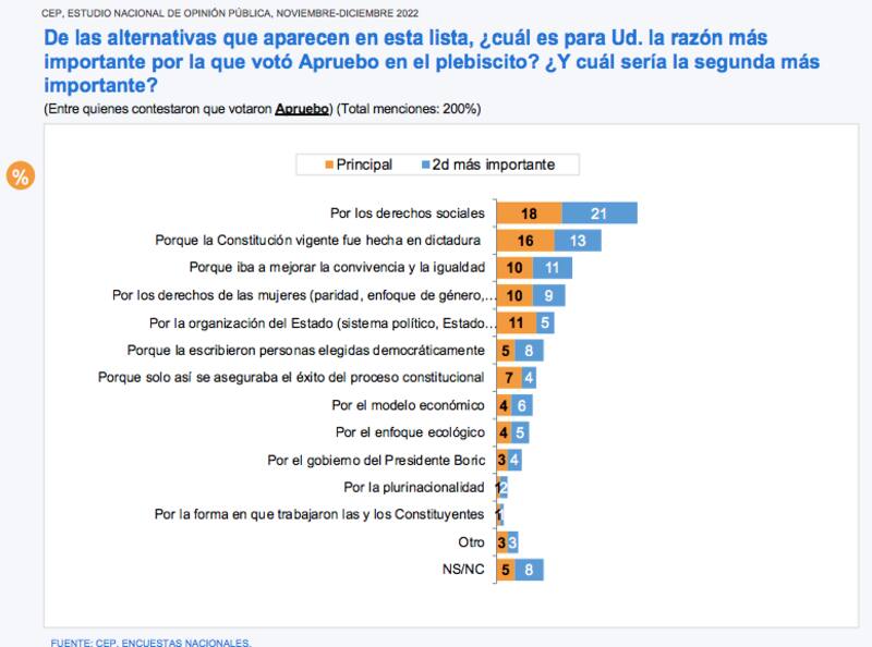En la contraparte, entre quienes votaron Apruebo, los encuestados respondieron que la principal razón para votar por esa opción fue por el catálogo de derechos sociales que venía incorporado en la propuesta de nueva Constitución. Como segundo argumento, revela el CEP, está que votaron a favor del texto porque “la Constitución vigente fue hecha en dictadura”. Como tercer argumento se menciona que la propuesta “iba a mejorar la convivencia y la igualdad”.