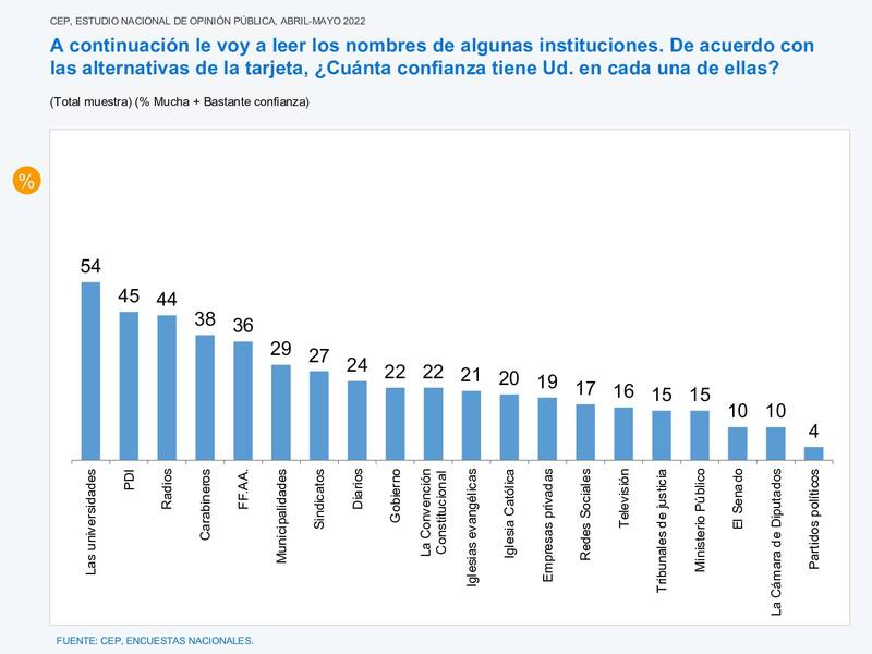 Desde la otra vereda, los partidos políticos generan menor confianza con un 4%, le sigue la Cámara de Diputados y el Senado con un 10% cada uno, y el Ministerio Público junto con los Tribunales de Justicia un 15%.