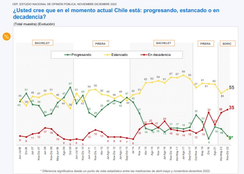 Además, un 55% de los encuestados cree que el país está actualmente estancado (4 puntos más que en la última CEP), mientras que quienes creen que el país está progresando solo llegan al 9%, lo que presenta una baja significativa de 7%.