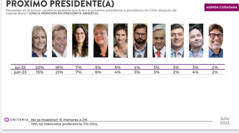 La Encuesta Agenda Criteria entregó sus resultados correspondientes al mes de julio, donde se destaca que la alcaldesa de Providencia, Evelyn Matthei, lidera las preferencias presidenciales de momento, desplazando así al excandidato presidencial y fundador del Partido Republicano, José Antonio Kast, quien encabeza tal lista el mes pasado.