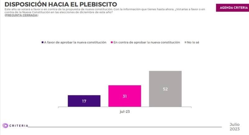 Sobre el plebiscito de salida, instancia en que se aprobará o rechazará la propuesta de nueva Constitución, un 52% de los encuestados aún no tiene una postura definida, mientras que un 31% votaría rechazo y solo un 17% aprobaría el texto emanado del órgano redactor.