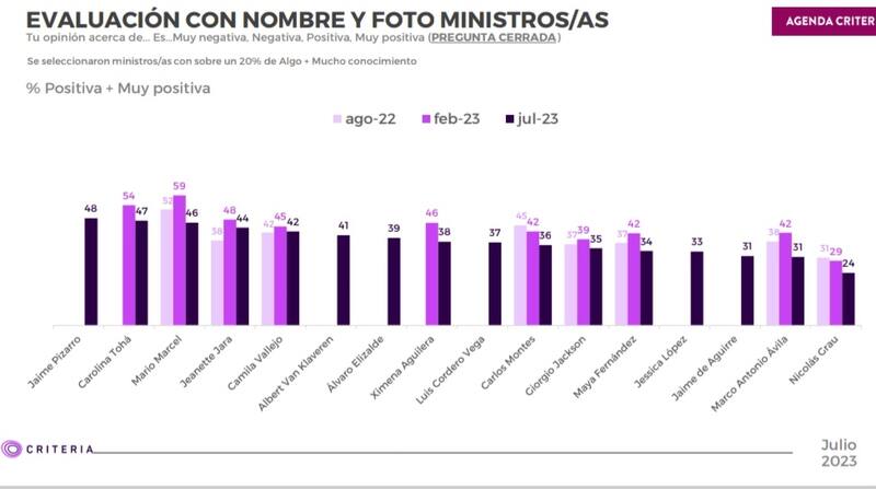 Con respecto a los ministros de Estado, el titular de Deportes, Jaime Pizarro, obtiene la mejor evaluación con un 48%, seguido de la ministra Tohá; con un 47%, el ministro de Hacienda, Mario Marcel; con un 46%, y la titular del Trabajo y Previsión Social, Jeanette Jara; con un 44%.