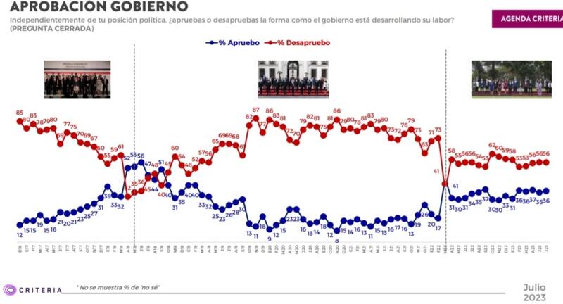 Sobre el gobierno, éste alcanza una aprobación de 36%, mientras que un 56% desaprueba la actual administración.