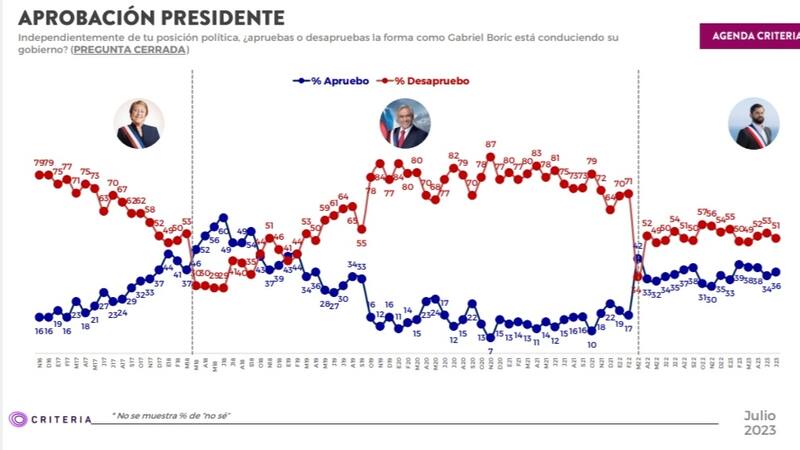 Del total de los encuestados, un 36% aprueba al Presidente Boric, lo que se traduce en un alza de dos puntos con respecto a junio, mientras que un 51% lo desaprueba.