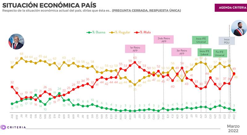 Respecto de la situación económica del país, un 49% señala que es mala (13 puntos más que el mes precedente) y sólo un 3% diría que es buena, mientras que las principales urgencias ciudadanas en marzo de 2022 se mantienen a los temas de seguridad pública, derechos sociales y medioambientales.