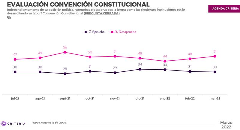 En este mismo ámbito, se indica, en marzo la evaluación del desempeño de la Convención Constitucional tiene leves cambios a la baja respecto del mes anterior: así, un 51% de los encuestados desaprueba su labor y un 30% la aprueba.