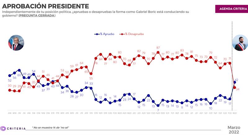 El primer mes de gobierno del Presidente Gabriel Boric obtuvo un 42% de aprobación ciudadana, mientras que la desaprobación alcanzó un 34%. Esto supone 4 puntos porcentuales menos de aprobación que Piñera en su primer mes de gobierno y 4 puntos más de desaprobación.