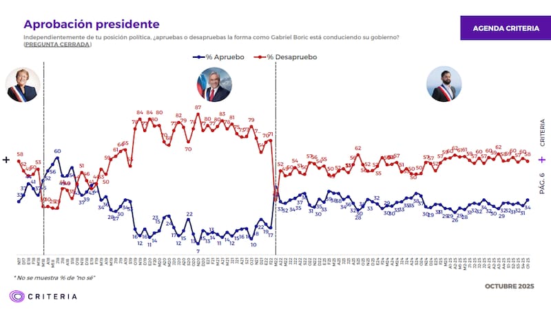 Este domingo 5 de octubre, la empresa de consultoría y de estudios de opinión Criteria dio a conocer los resultados de su encuesta semanal relativa al apoyo que suscitan los candidatos a la Presidencia, la aprobación del gobierno y del Presidente Boric, entre otros temas de interés público. Esta semana, la candidata del oficialismo, Jeannette Jara, se mantuvo en el primer lugar de las preferencias en primera vuelta (27%), seguida por el abanderado del Partido Republicano, José Antonio Kast (26%) y la carta de Chile Vamos Evelyn Matthei (17%).