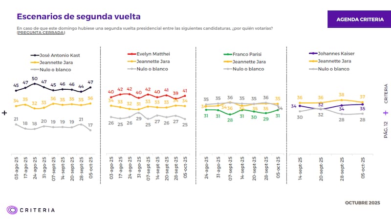 Según el sondeo, Jeannette Jara sí lograría imponerse frente a Franco Parisi o Johannes Kaiser, pero en ambos casos los porcentajes de voto nulo o blanco son mayores. En el primer caso 35% (=) respalda a Jara frente a un 31% (+2). Esta vez el porcentaje de votos nulos o blancos es de 34%. En cuanto a Kaiser, la militante PC se impuso con 37% (-1) versus 35% (+1). La cifra de votos nulos o blancos en este escenario es de 28%.