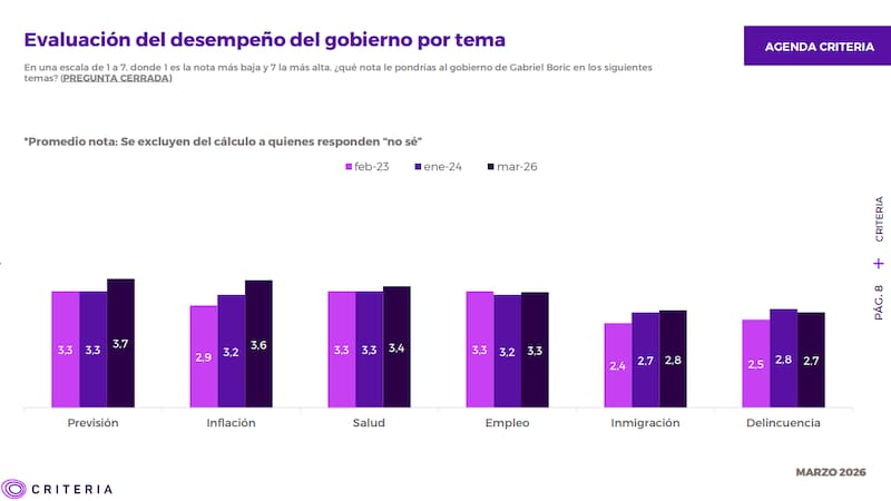 Por otro lado, la medición también consultó a sus encuestados que nota le pondrían al gobierno en diversos temas. En todos ellos, la administración Boric registró una “nota roja”.