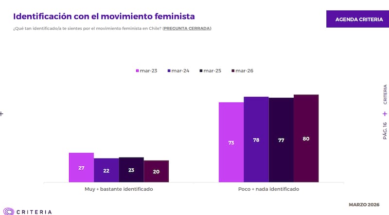 Respecto a la conmemoración del Día Internacional de la Mujer este 8 de marzo, frente a la consulta por ¿Qué tan identificado/a te sientes por el movimiento feminista en Chile?, solamente un 20% de las personas se mostraron muy o bastante identificado. En contraste, el otro 80% señaló estar poco o nada identificado.