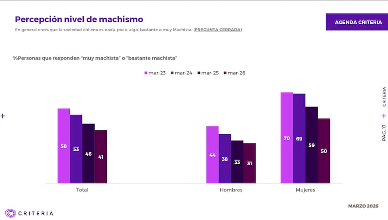 Por otro lado, solo un 41% de los encuestados señaló que considera a nuestro país “muy” o “bastante” machista, con un descenso constante desde 2023, cuando frente a la misma consulta un 58% de las personas señalaron estas opciones.
