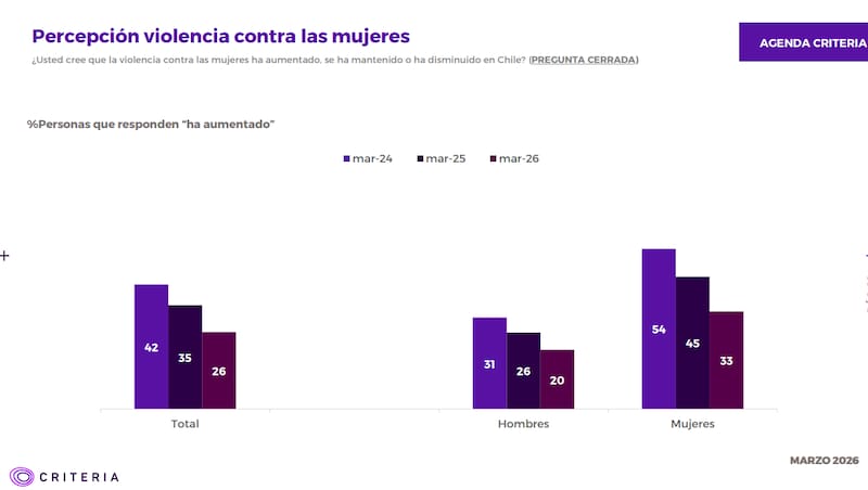 Finalmente, un 26% de la población considera que “ha aumentado” la violencia contra las mujeres en nuestro país. En comparación, en 2024 un 42% adoptó esta postura.