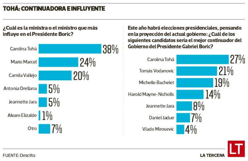 Durante su gestión, Tohá se posicionó como uno de los pilares del Mandatario y lideró la agenda de seguridad que -por la fuerza de los hechos- asumió el gobierno. Su protagonismo se ve reflejado en otro dato que entrega la encuesta: el 38% de los consultados afirma que es la ministra que más influyó en el Presidente, seguida por Mario Marcel (Hacienda, 24%) y Camila Vallejo (vocería, 20%).
