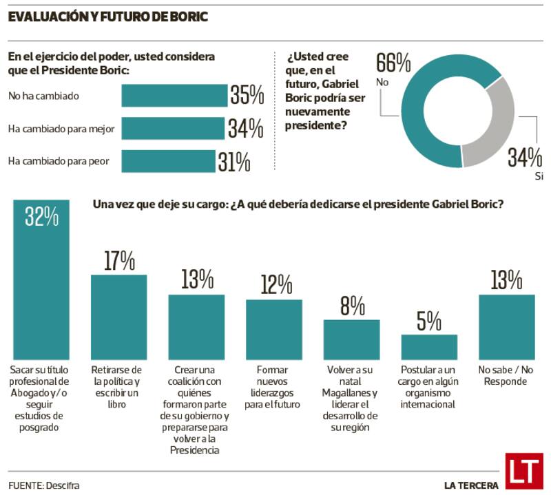 Sin embargo, esa opción no convence a los encuestados de Descifra. El sondeo muestra que un 66% no cree que Boric pueda ser nuevamente Presidente. Tironi plantea que esta cifra es alta, sin embargo se condice con el hecho de que aún es un Presidente en ejercicio. “Normalmente la buena imagen de los presidentes, y la nostalgia por ellos, comienza una vez que dejan La Moneda”, dice el sociólogo.