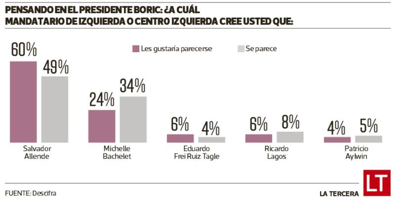 No obstante, para los encuestados hay una respuesta muy clara cuando se les consulta a qué Mandatario le gustaría parecerse el Presidente Boric: un 60% dice que a Salvador Allende. Mientras que, al preguntar a qué Mandatario se parece, un 49% responde también que al líder de la UP, seguido por un 34% que menciona a Bachelet.