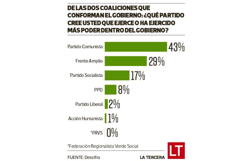 El Partido Comunista es -para el 43% de los encuestados- el partido que ejerce o ha ejercido más poder dentro del gobierno. El resultado no deja de ser relevante, tomando en cuenta lo inédito del esquema de este gobierno -sustentado hasta el día de hoy en dos coaliciones-, lo que ha provocado una pugna por la influencia entre el PC y el Frente Amplio, y el bloque del Socialismo Democrático.