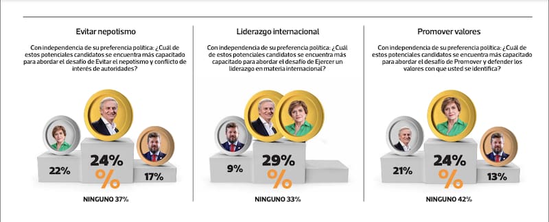 Luego de cotejar los datos, el análisis, según Descifra, es contundente: Evelyn Matthei obtiene la mayor cantidad de primeros lugares y lidera en todos los atributos vinculados a la gestión pública y política. De hecho, la pregunta donde la exalcaldesa de Providencia consiguió un margen más abultado sobre sus contendores fue la de “Entregar gobernabilidad y lograr acuerdos políticos”, donde registró una ventaja de 32 puntos porcentuales por sobre Kast, quien le sigue en el podio.