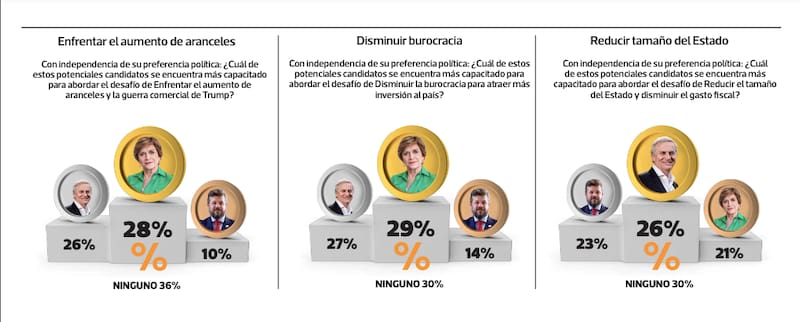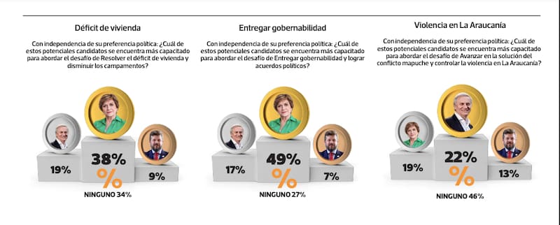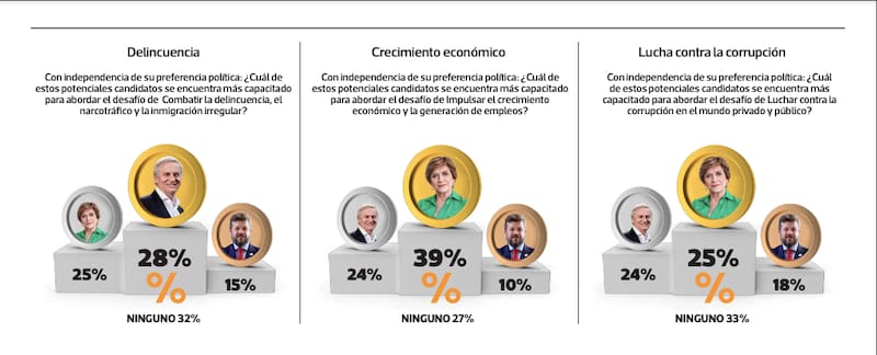 Este sondeo de Descifra midió a Evelyn Matthei, José Antonio Kast y Johannes Kaiser respecto de sus capacidades para hacerse cargo de los 12 principales desafíos que enfrentarán si llegan a La Moneda. La exalcaldesa de Providencia lideró en la mayoría de ellas, pero el candidato de Republicanos se impuso en los temas de seguridad y orden público.