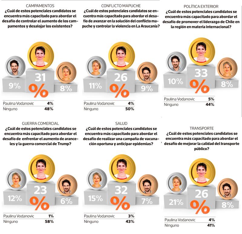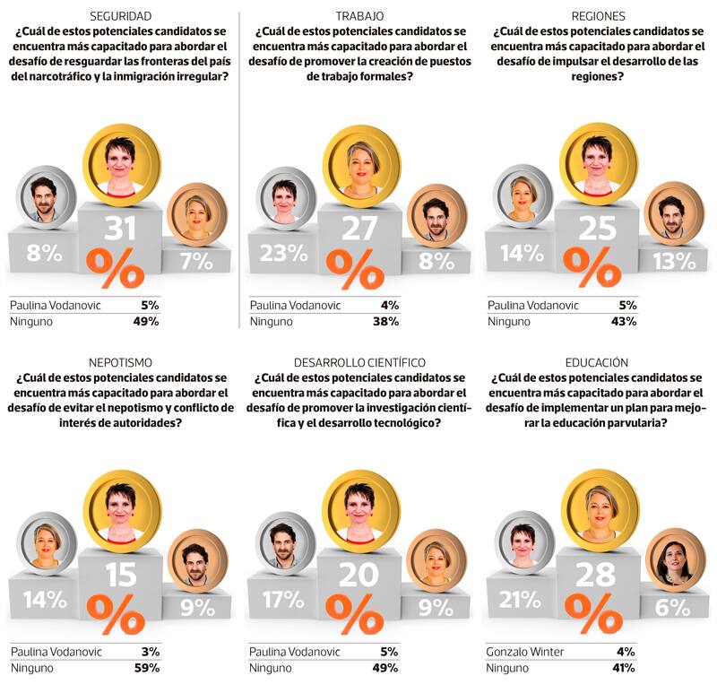 Su retadora más cercana fue la recientemente renunciada titular de Trabajo, Jeannette Jara. La carta comunista se impuso en las tareas de promover la creación de trabajos, mejorar la educación parvularia y en promover los derechos de las mujeres. Por su parte, el mejor lugar que consiguió la carta del Frente Amplio, Gonzalo Winter, fue un segundo puesto en cuatro categorías: resguardar las fronteras, controlar el aumento de campamentos, promover la investigación científica y promover el liderazgo de Chile en la región.