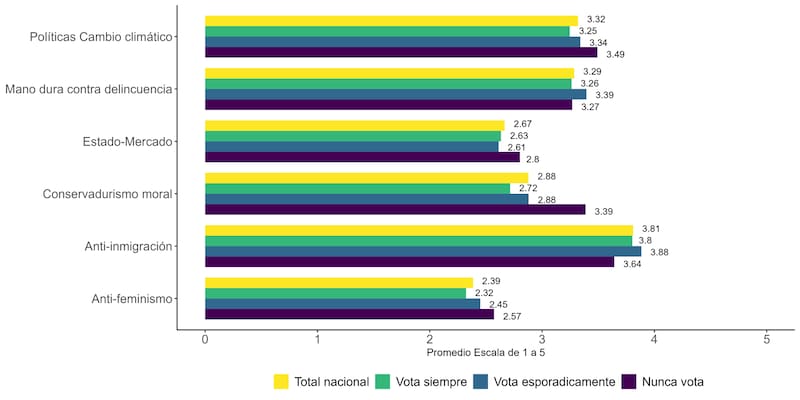 Además, quienes “nunca” votan tienen una mayor asociación -que los otros dos grupos- hacia posiciones ideológicas relacionadas al conservadurismo moral o el antifeminismo. Por su lado, los que votan “esporádicamente” manifestaron tener una mayor sintonía hacia la derecha con discursos de antiinmigración y mano dura contra la delincuencia.