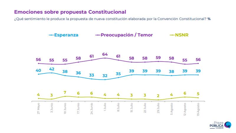 Respecto a las emociones que despertaría el la propuesta para nueva Constitución, la “esperanza” se mantiene por segunda semana consecutiva en un 39% del respaldo, mientras que la “preocupación/temor”, incrementó un punto desde el 55 al 56%. Quienes no saben o no responden, disminuyó un punto del 6 al 5%.