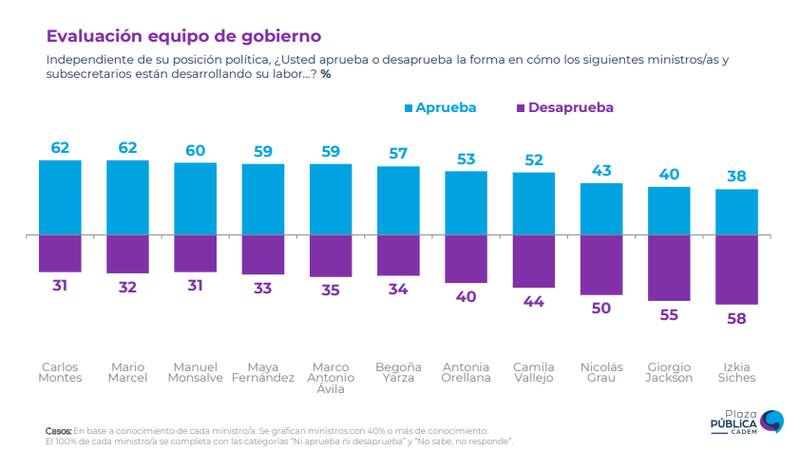 En la misma medición, el ministro de la Segpres, Giorgio Jackson registra un 55% de desaprobación y un 40% de aprobación y le sigue el titular de Economía, Nicolás Grau con 50% de reprobación y un 43% de respaldo.