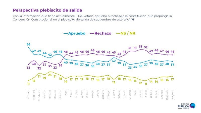 Durante la noche de este viernes se conocieron los resultados de la última encuesta Plaza Pública Cadem que realizó la medición de la tercera semana de agosto, respecto a la intención de los consultados por votar en el plebiscito del próximo 4 de septiembre, donde la opción Rechazo alcanzó un 46% de respaldo, mientras que el Apruebo bajó un punto respecto a la semana anterior, alcanzando 37%.