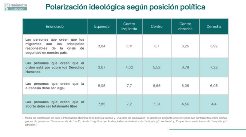 En relación a la polarización ideológica entre las personas, la encuesta apunta a que las personas que se identifican con la derecha sienten una mayor simpatía por aquellos que consideran que los migrantes son los principales responsables de la crisis de seguridad en el país, lo que difiere considerablemente con la izquierda donde la cifra de aceptación es considerablemente inferior (6,25 puntos en la centro derecha y 5,92 en la derecha de un máximo de 10, frente a un 3,84 en la izquierda y 5,11 en la centro izquierda).