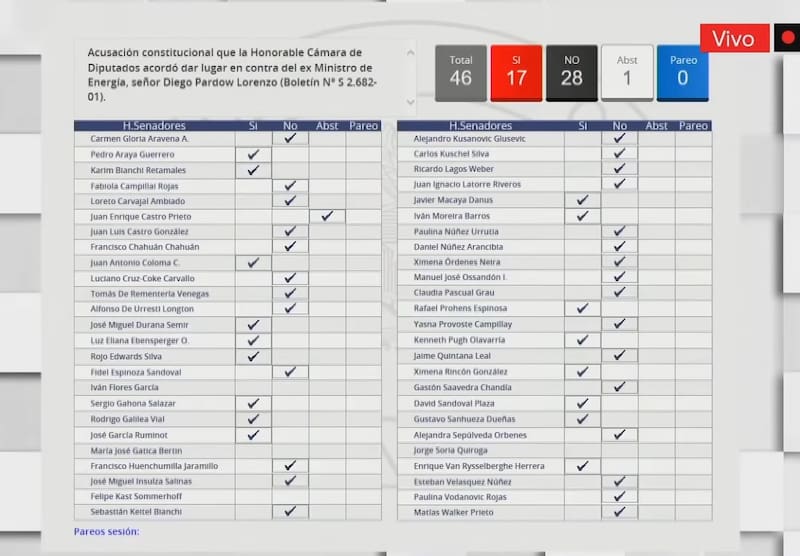 A las 15.19 horas se inició la sesión en que se debe votar la acusación constitucional contra el exministro Diego Pardow. Los senadores pasaron a dar cuenta de sus votos. La senadora Carmen Gloria Aravena, independiente de oposición, anunció un voto en contra.