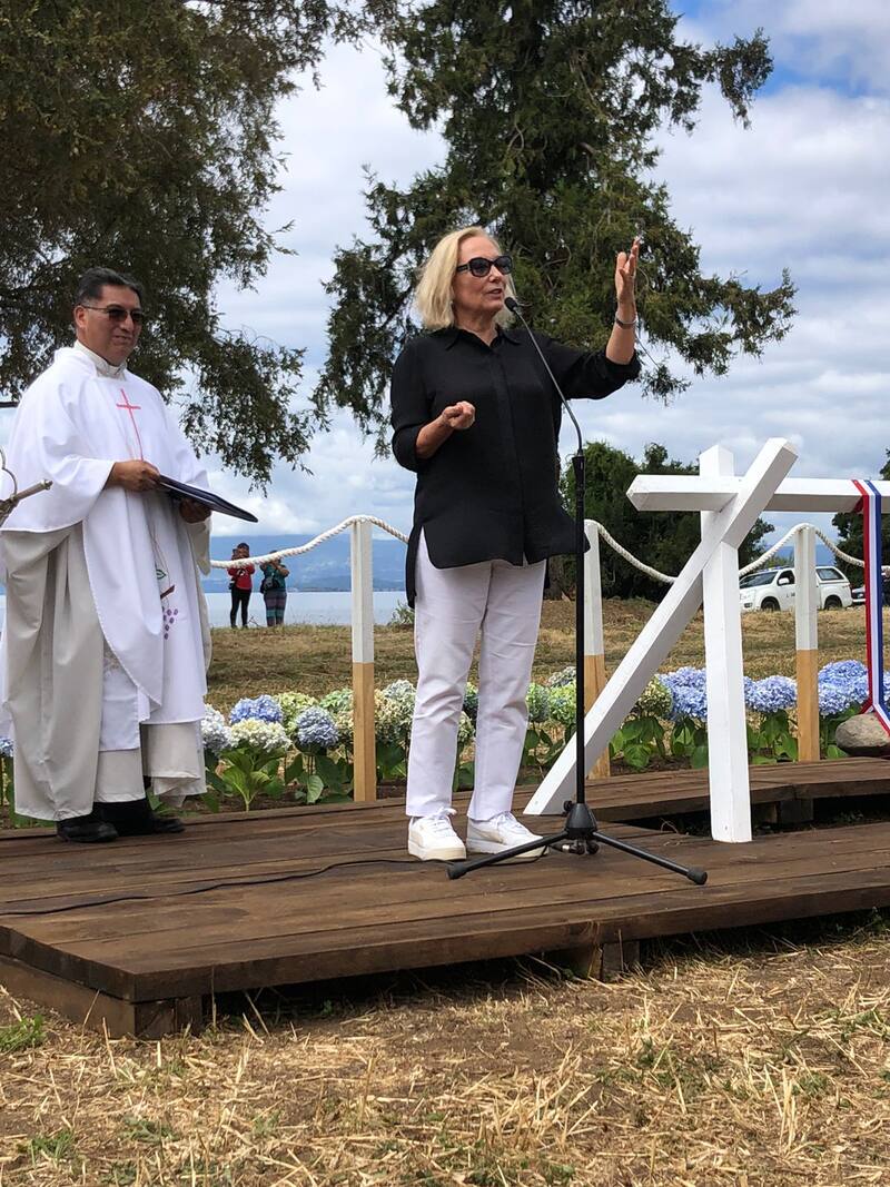 A pasos de la misa, se realizó la puesta de la primera piedra de la nueva capilla que se construirá cerca del lago Ranco, justamente para que el lugar se pueda observar desde las ventanas de dicha iglesia.