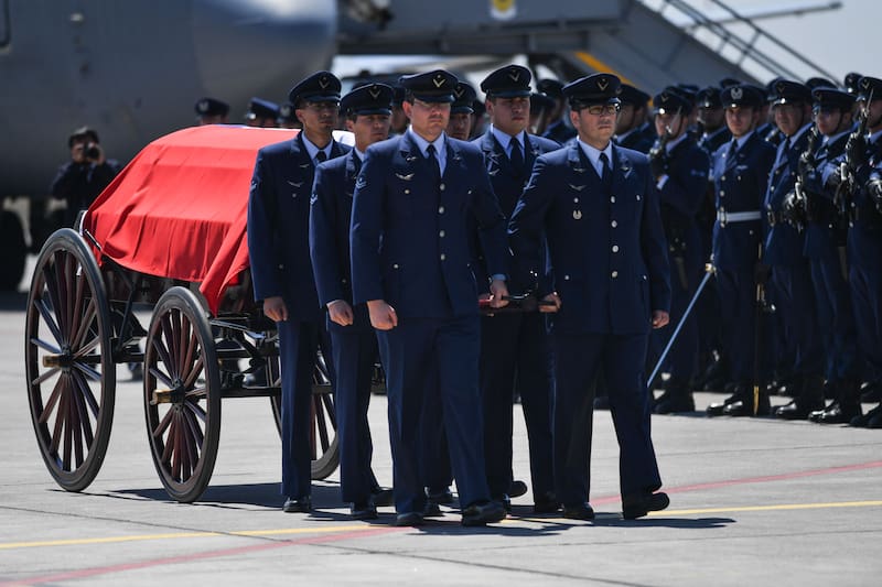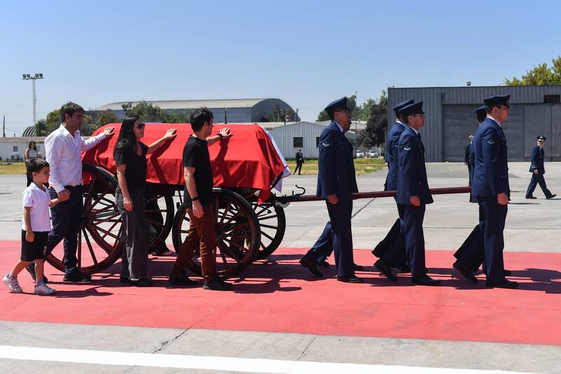 De traje negro, camisa blanca y anteojos de sol, Boric se posicionó para esperar que llegara del avión de la Fach. Cuando aterrizó, seis suboficiales de la Fach cubrieron la urna con una bandera de Chile y la pusieron sobre un carruaje que minutos después se paseó pausadamente, al ritmo de una melodía fúnebre, por la losa mientras se le rendían homenajes.