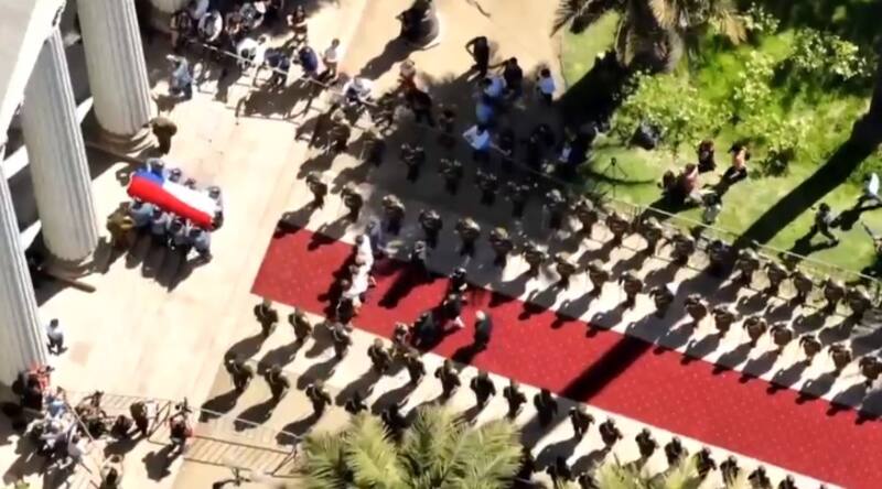 Mientras de a poco la calle se iba llenando de banderas de Chile, el cortejo fúnebre que venía desde el Grupo 10 de la Fuerza Aérea (Fach) en Pudahuel se acercaba hasta el Congreso. Pasado las 16.00, con varias horas de retraso respecto del improvisado diseño original de la ceremonia, el féretro entró por calle Catedral.