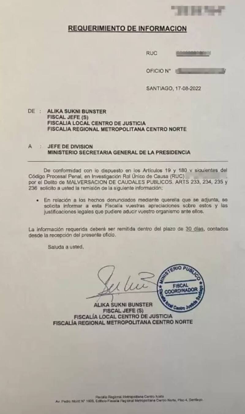 La Fiscalía Metropolitana Centro Norte ofició al Ministerio Secretaría General de la Presidencia (Segpres) para solicitar a la cartera encabezada por Giorgio Jackson antecedentes en el marco de la indagatoria de un presunto delito de malversación de caudales públicos en la impresión de 700 mil ejemplares de la propuesta de nueva Constitución.
