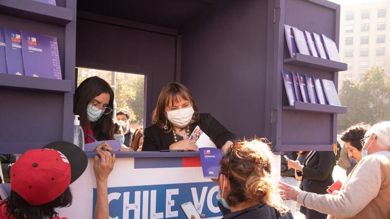 Frente al Palacio de La Moneda, específicamente en la Plaza de la Constitución, el gobierno instaló el kiosco “Chile Vota Informado”, el cual funcionará como punto de entrega de ejemplares gratuitos de la propuesta de nueva Constitución.